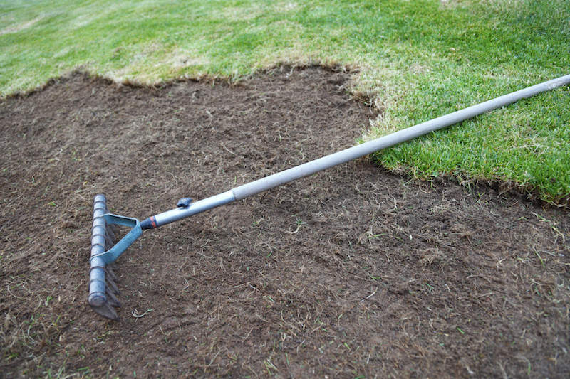 - Prepare the damaged area by removing any dead grass or debris and raking it lightly with a garden rake.
