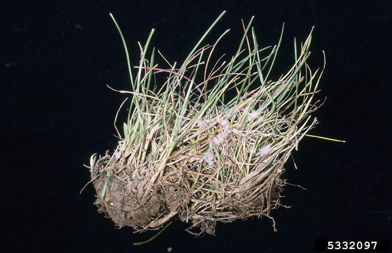 - Crowns and roots of grass plants develop dark brown rot, and grasses thin and die out.